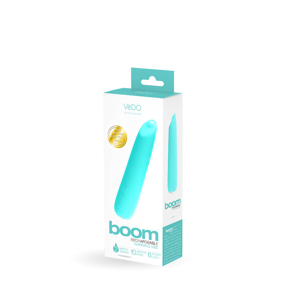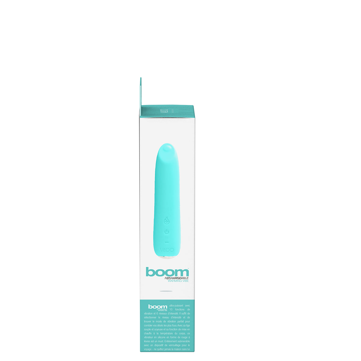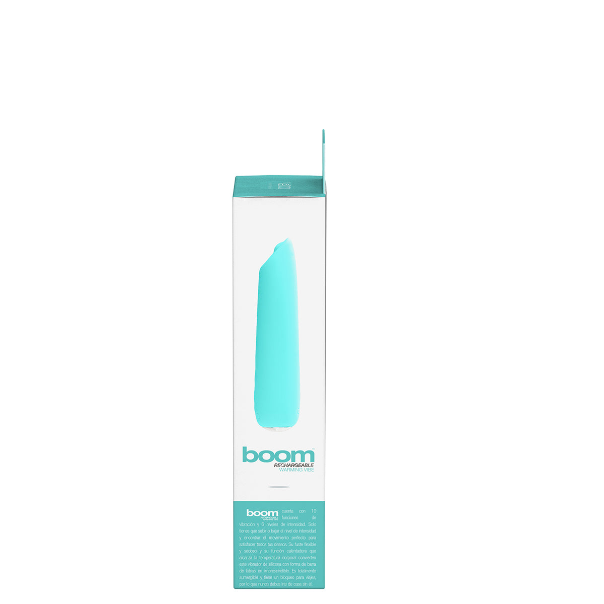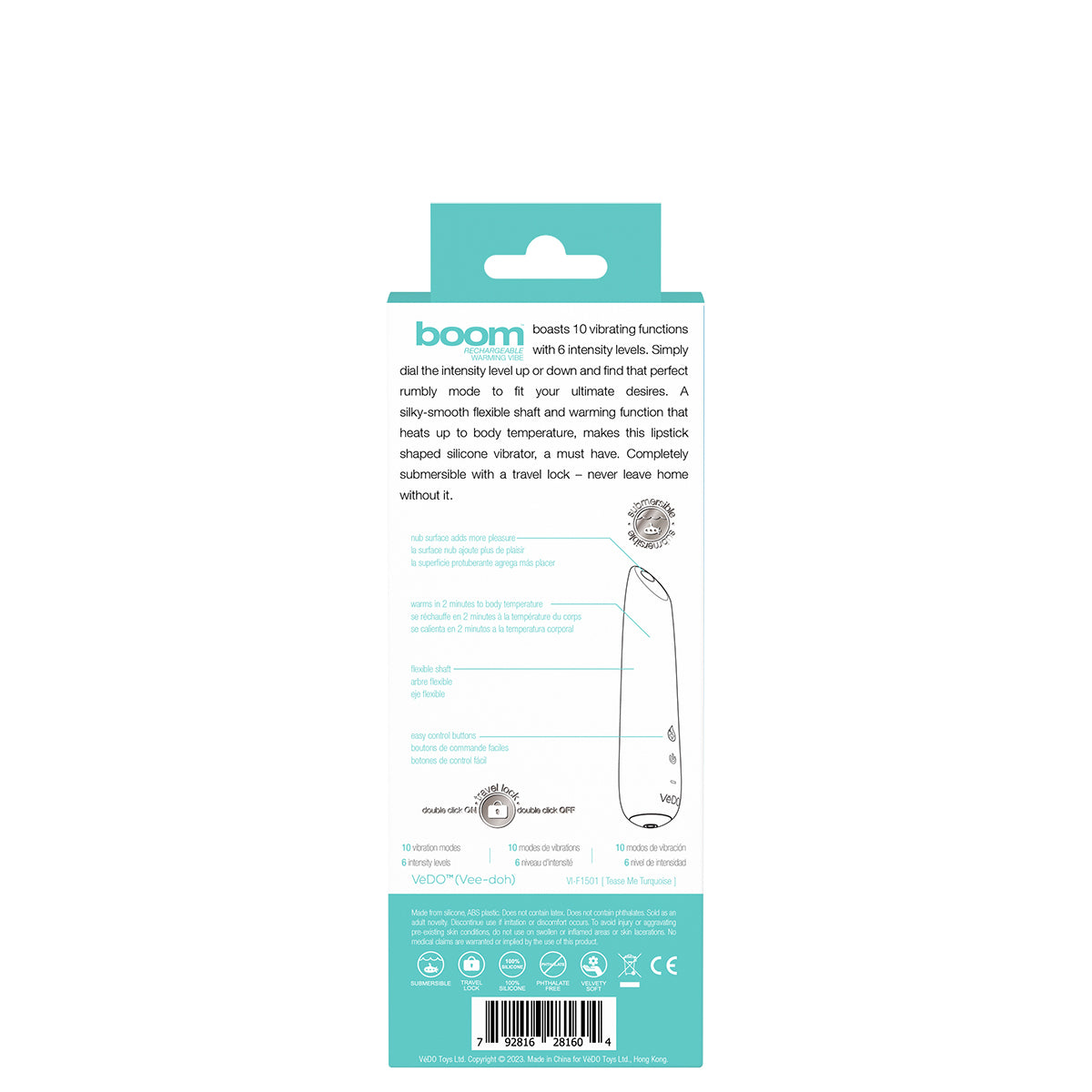 BOOM boasts 10 vibrating functions with 6 intensity levels. Simply dial the intensity level up or down and find the perfect rumbly mode to fit your ultimate desires. A silky-smoothh flexible shaft and warming funtion that heats up to body temperature makes this lipstick shaped silicone vibrator a must have. Completely submersible with a travel lock - never leave home without it.